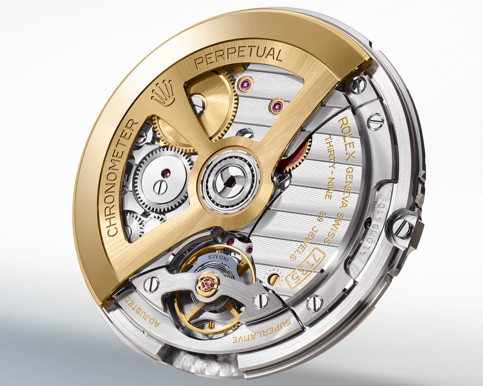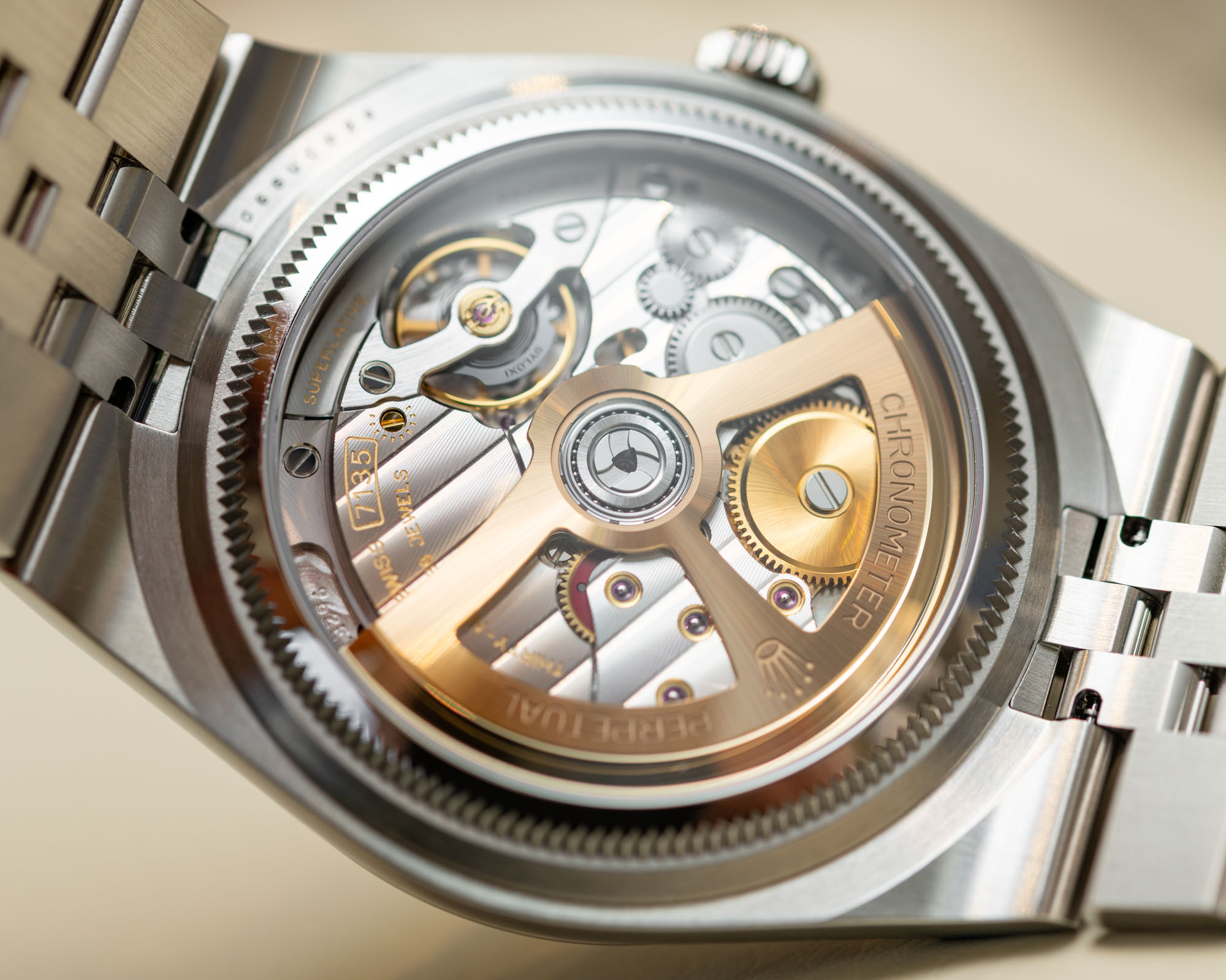 The simulated rotor and faux Rolex Côtes de Genève decoration on the bridges replicate the genuine movement’s finishing, visible through a sapphire-style transparent case back.