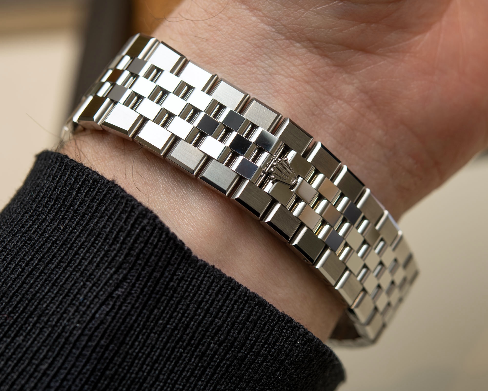 The Land-Dweller Replica reinterprets the complex beauty of integrated bracelets with the all-new Flat Jubilee bracelet, a faithful recreation of Rolex’s five-link classic, seamlessly connected to the Oyster-style case. The bracelet features polished and satin finishes on simulated metal surfaces, designed to emulate the luxurious textures of the original.