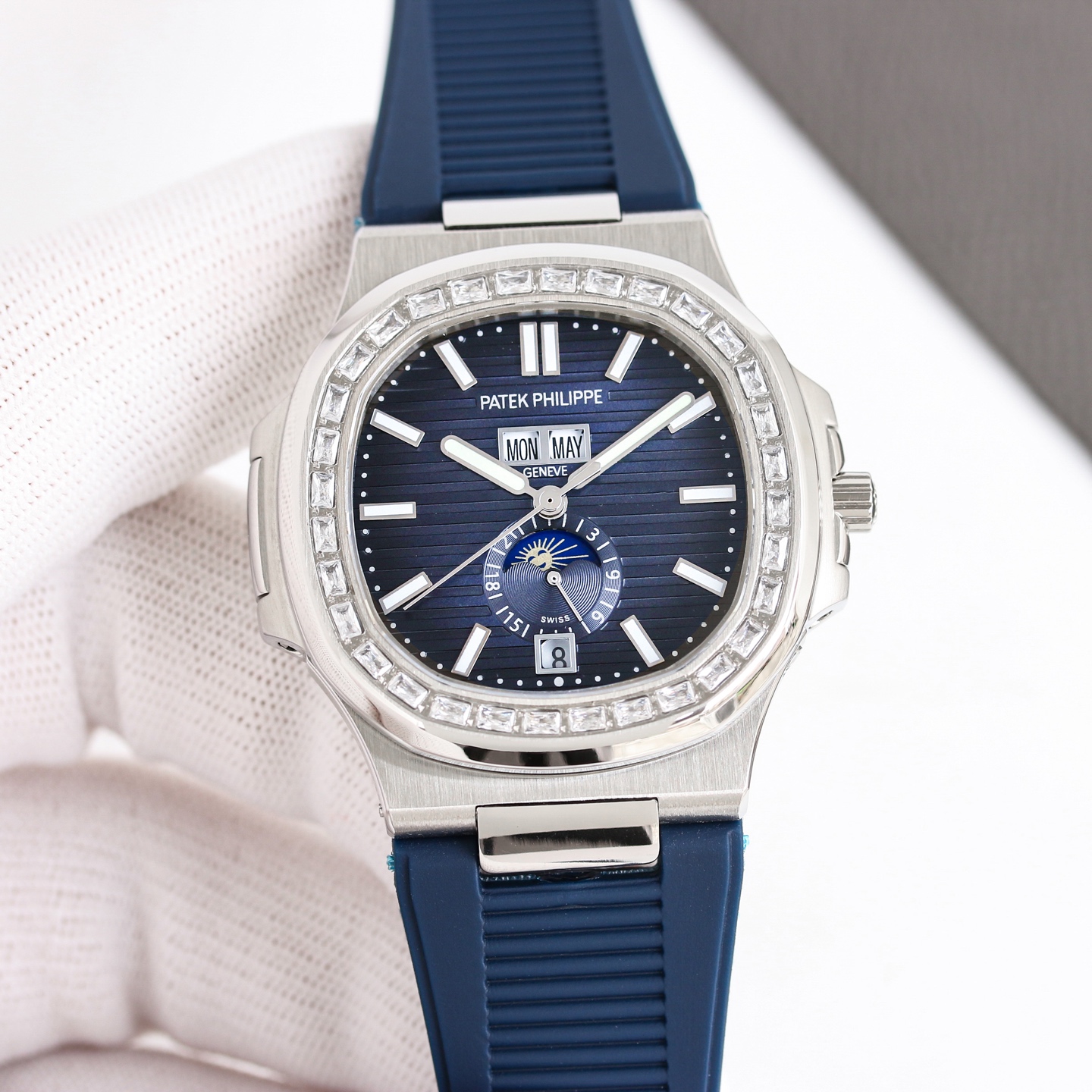 SJ produces high-end replicas. TW releases the new Patek Philippe PPABJ1 Nautilus 5726/1A0 – silver case with diamonds and dark blue strap