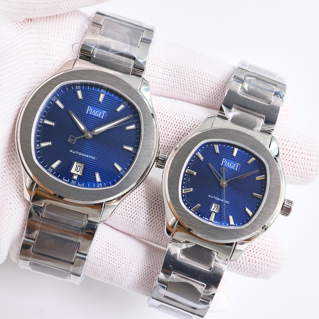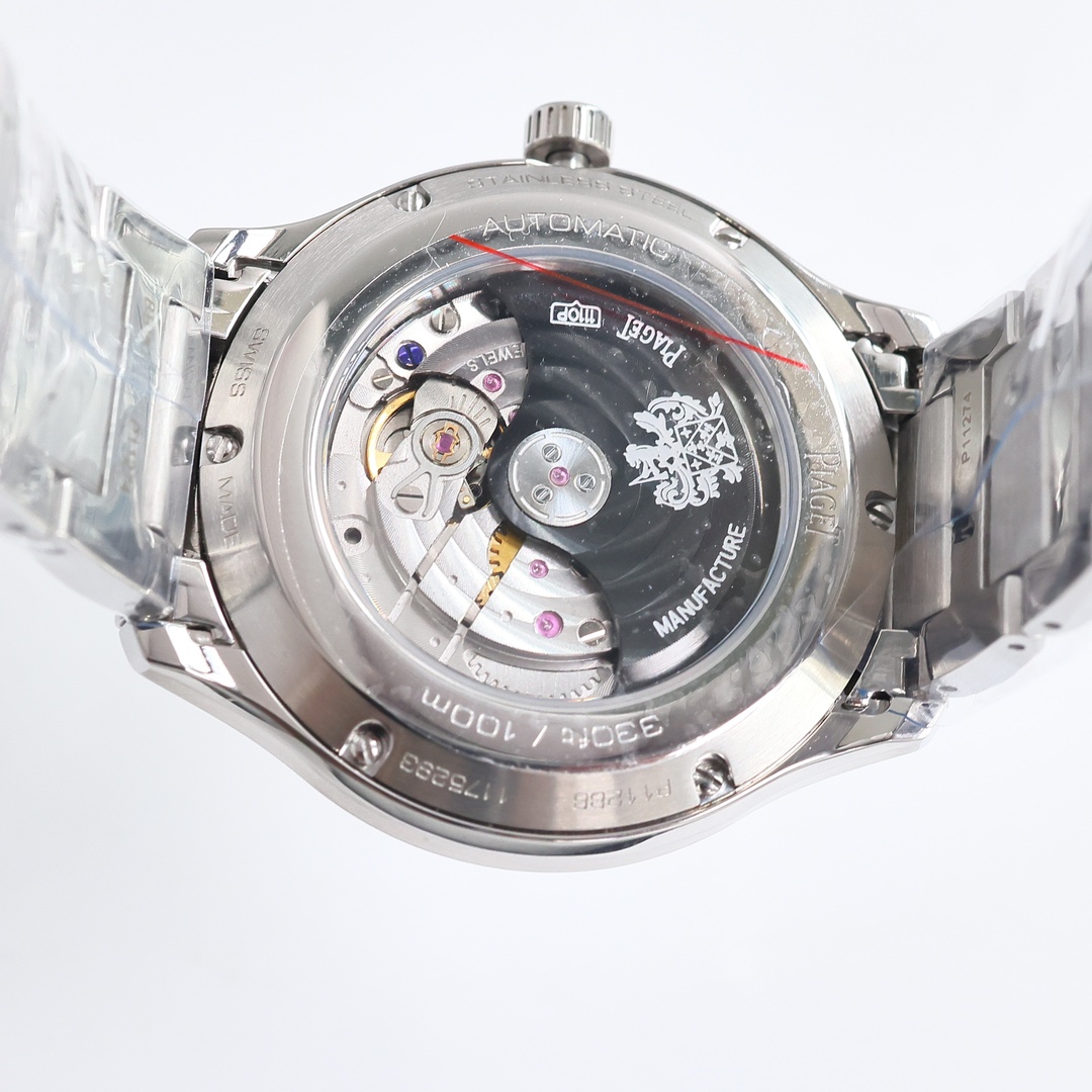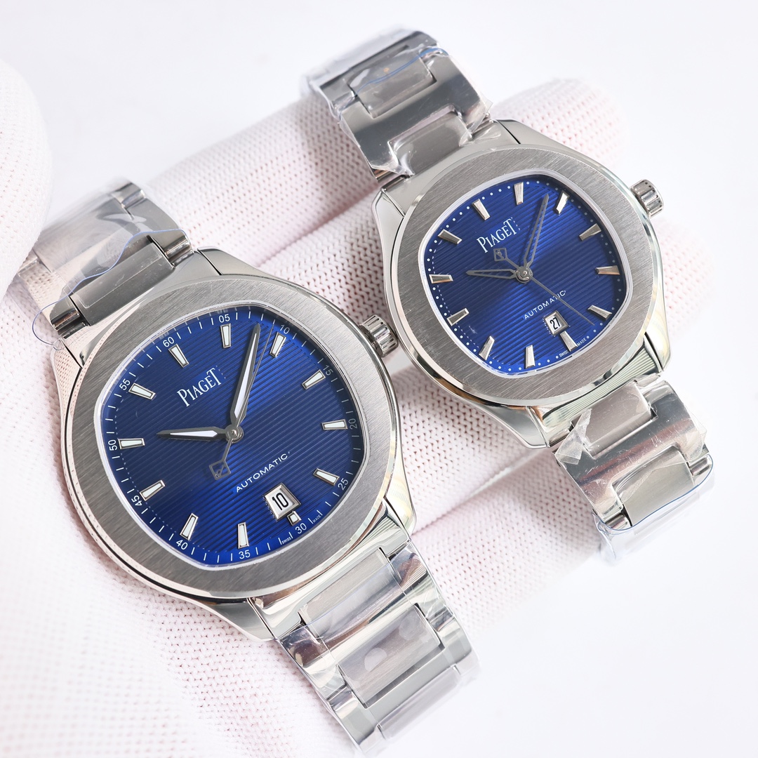 1. Equipped with a customized 9015 modified 1110P automatic movement with a 50-hour power reserve. 2. The 316LT strap with a horizontal brushed bead echoes the case's "square within a circle, circle within a square" design. The original double snap clasp is stamped with the Piaget logo. The strap's tips are stamped with "BBWLP11374 for men and PMBB P11815 for women."