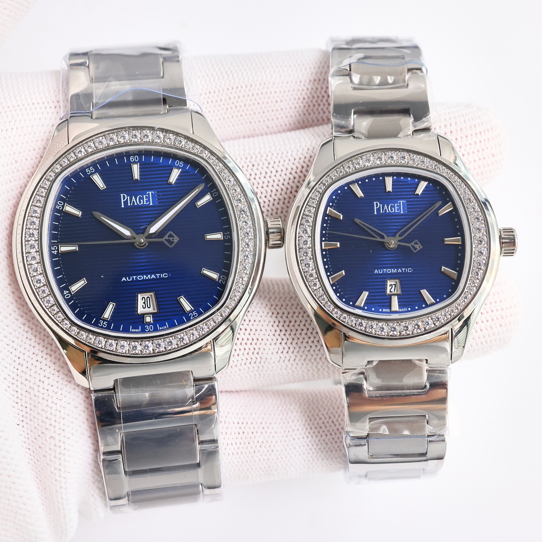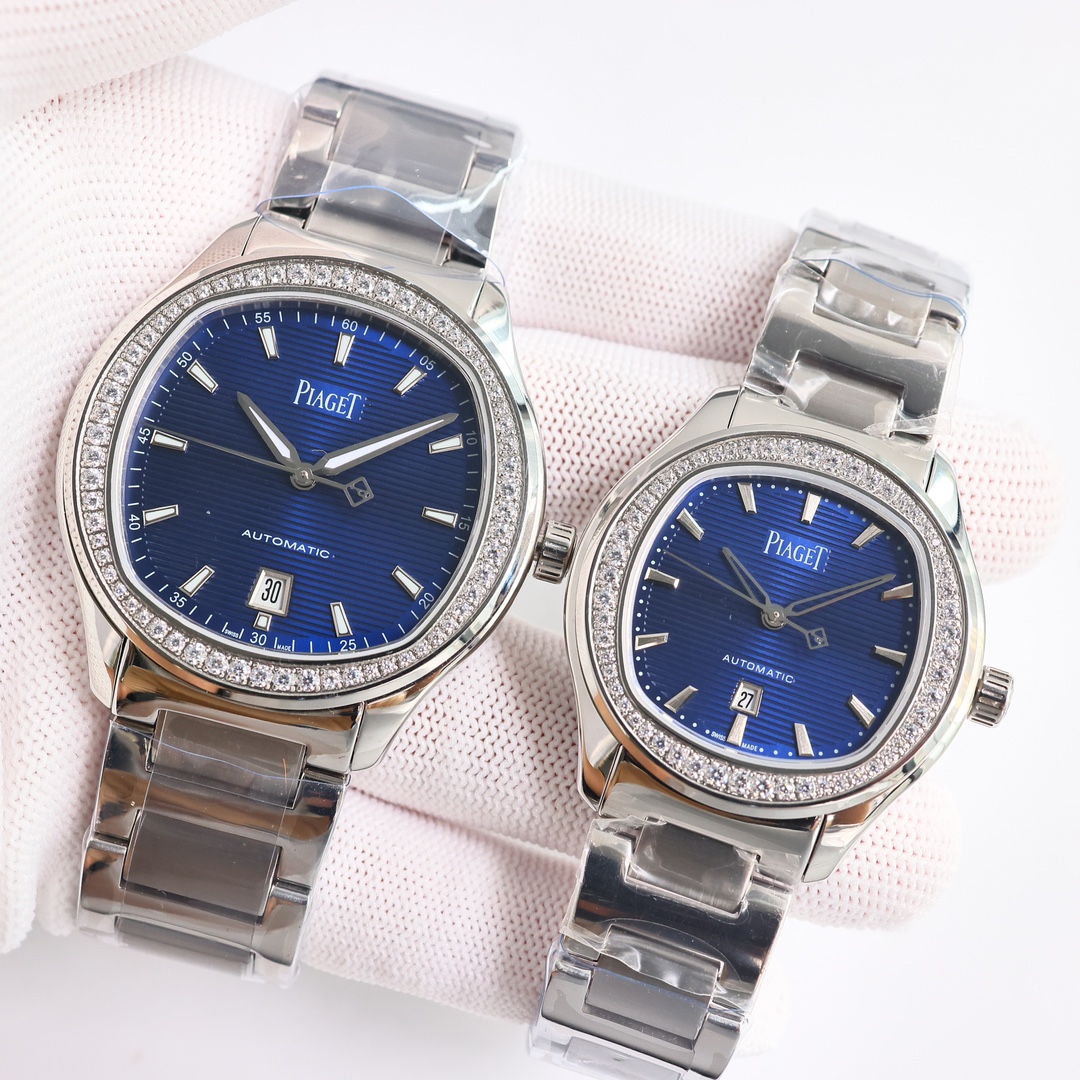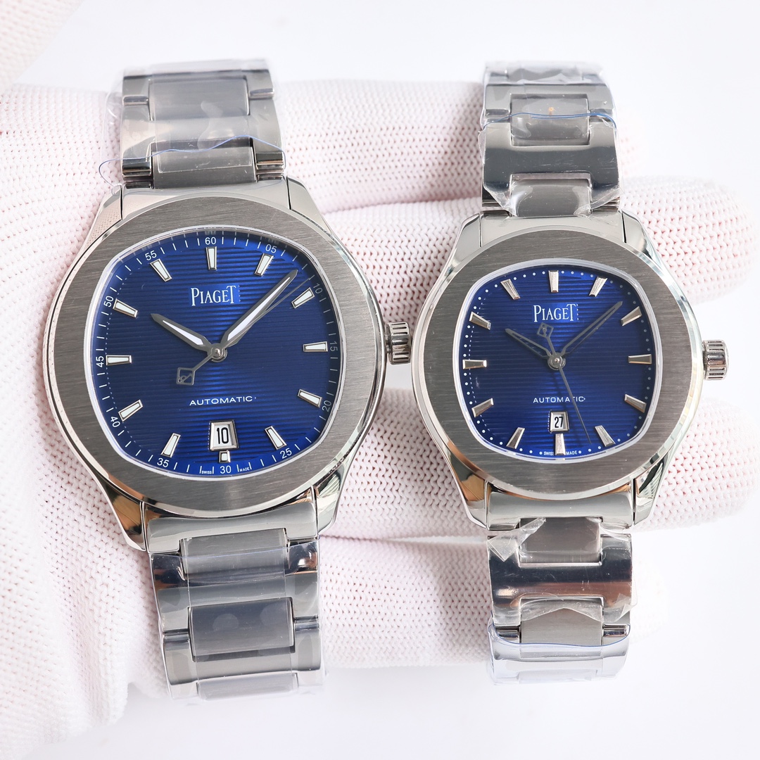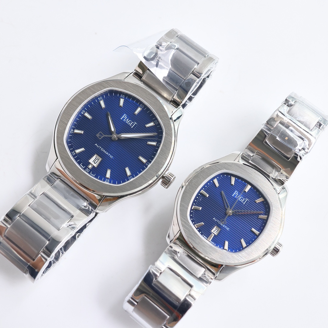 1. Equipped with a customized 9015 modified 1110P automatic movement with a 50-hour power reserve. 2. The 316LT strap with a horizontal brushed bead echoes the case's "square within a circle, circle within a square" design. The original double snap clasp is stamped with the Piaget logo. The strap's tips are stamped with "BBWLP11374 for men and PMBB P11815 for women."