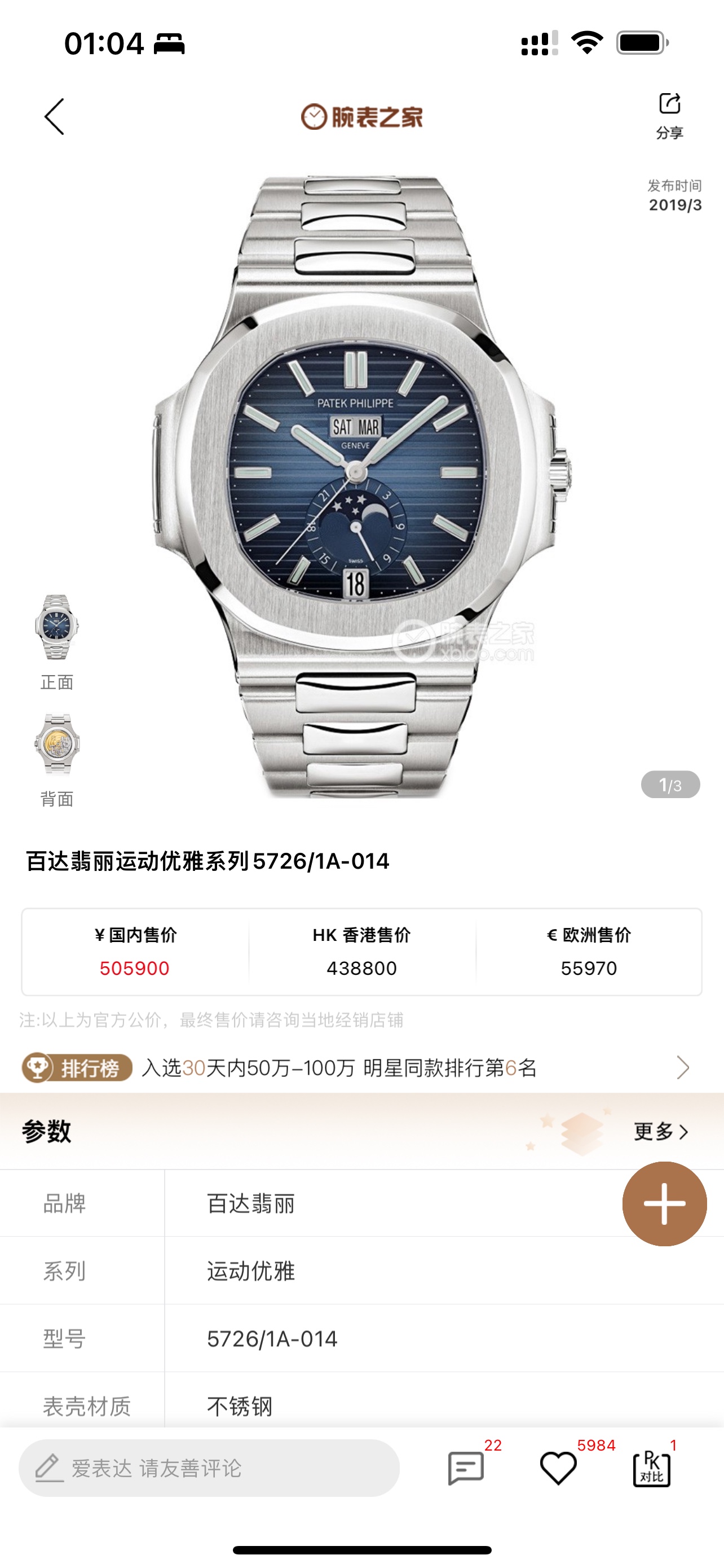 TW Launches the New Patek Philippe Nautilus 5726/1A - Dark Blue with Metal Strap