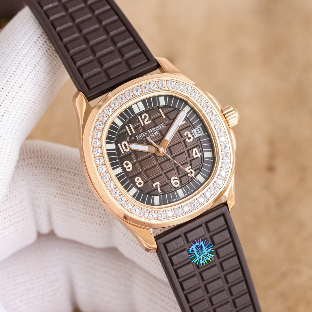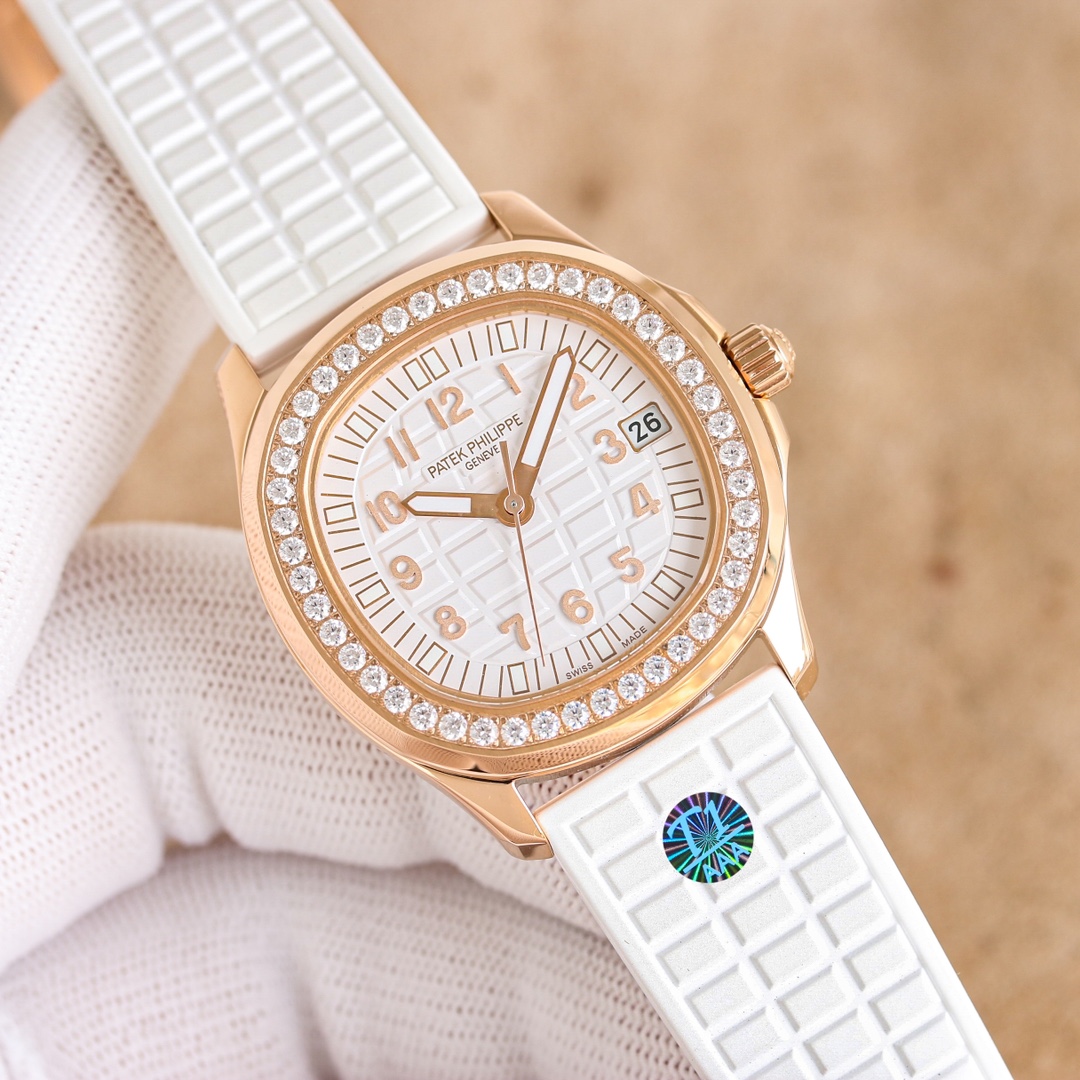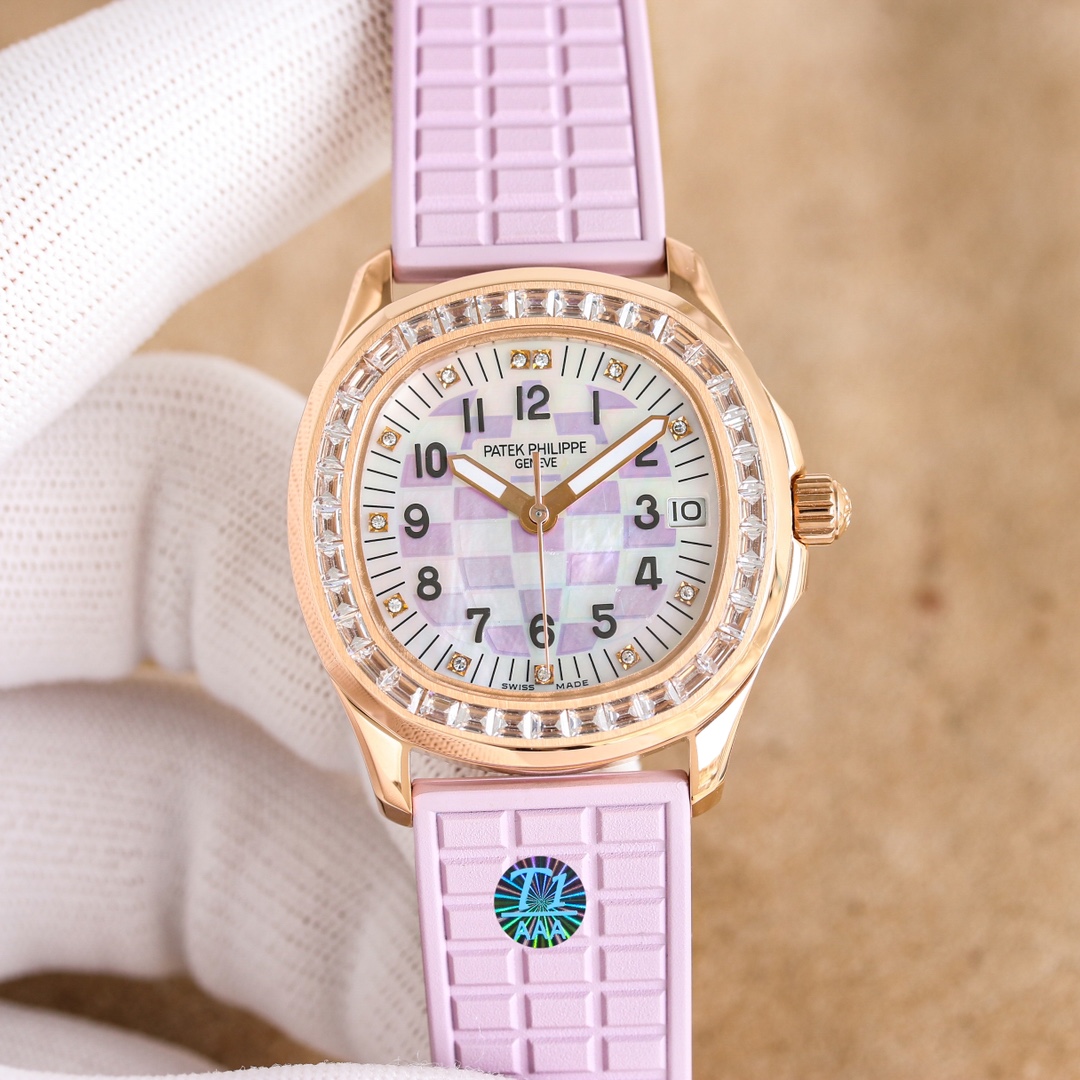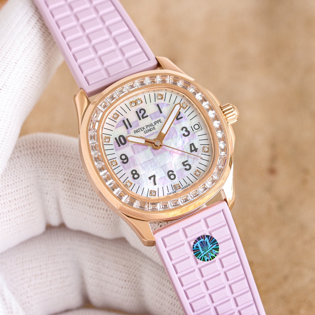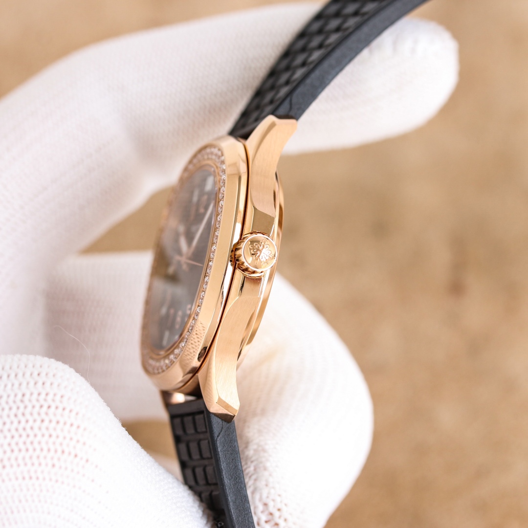 Case: 35.6mm in diameter, the case is crafted from 316 stainless steel, entirely CNC-finished, embodying the essence of meticulous craftsmanship. A ring of Swarovski diamonds inlaid around the case bezel adds a touch of exquisite beauty, enhancing the wearer's aristocratic aura. The three-dimensional grenade pattern echoes the regular relief dial, while the 12 independently molded Arabic numerals create a vibrant and stylish look. Viewed through the sapphire crystal, the watch exudes a sense of fluidity and harmony. The unique fluororubber strap accentuates its sporty and stylish design. Using the same grid design as the dial, the different approaches create a seamless, yet integrated, aesthetic. With a classic folding snap clasp, the edge of the clasp is polished very well. When you open the clasp, you can see the English letters of Patek Philippe engraved on the inner clasp. The lettering is of the same size and is still very clear when viewed through a magnifying glass. It fully complies with the original craftsmanship. The bottom cover with a transparent design can clearly see the overall structure and operation of the movement through the high-definition sapphire crystal glass mirror. It is equipped with an exclusive customized Ca1.324 integrated movement, which completely restores every detail of the original movement. The two large and small gears on the left and right sides of the central axis are also perfectly restored. Its unique styling style has never been ignored. It adopts a shape that is both round and square, and neither round nor square. The individual design exudes elegance and atmosphere! It makes people know Patek Philippe at a glance, and the bright colors highlight its unique charm.