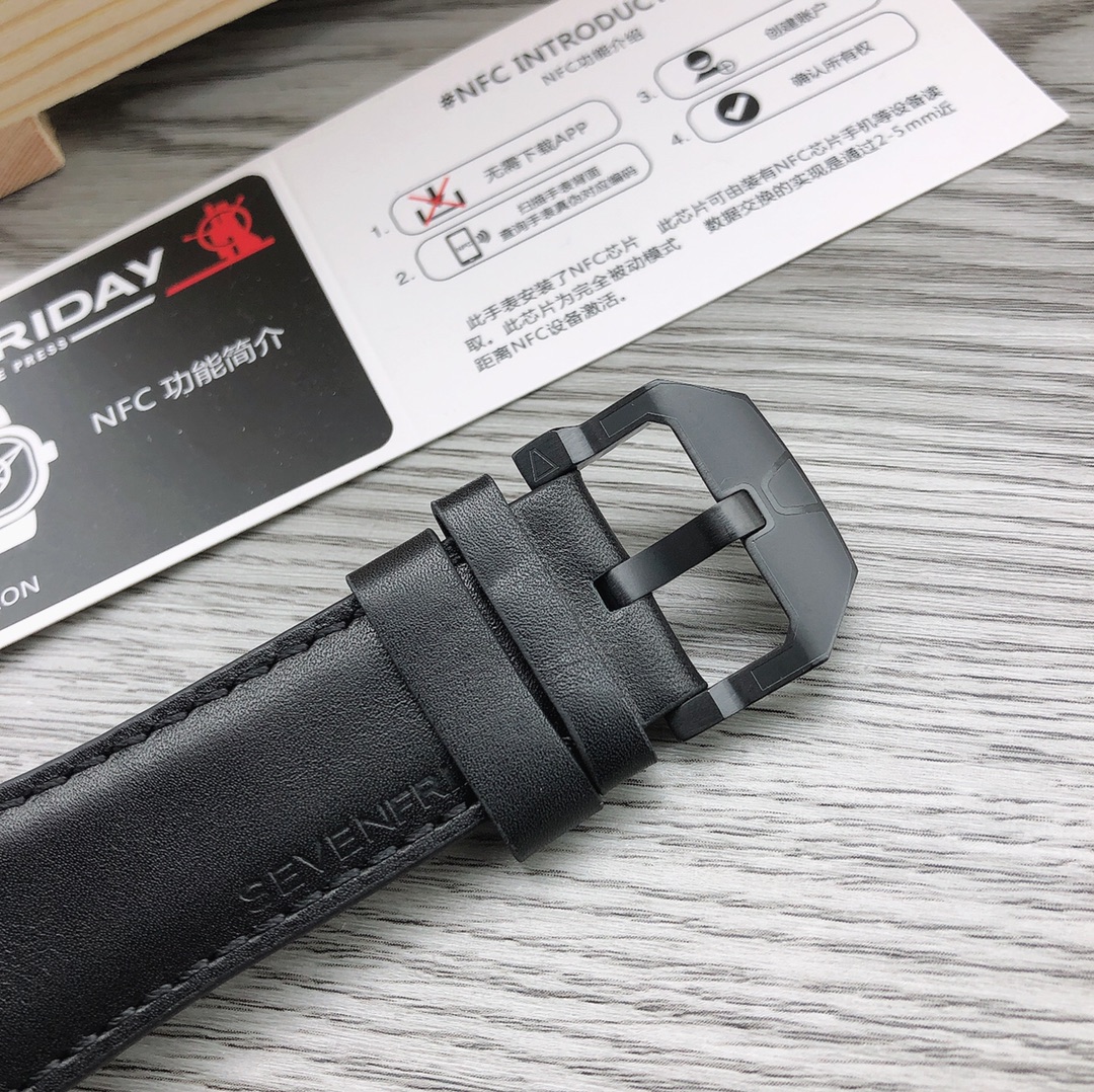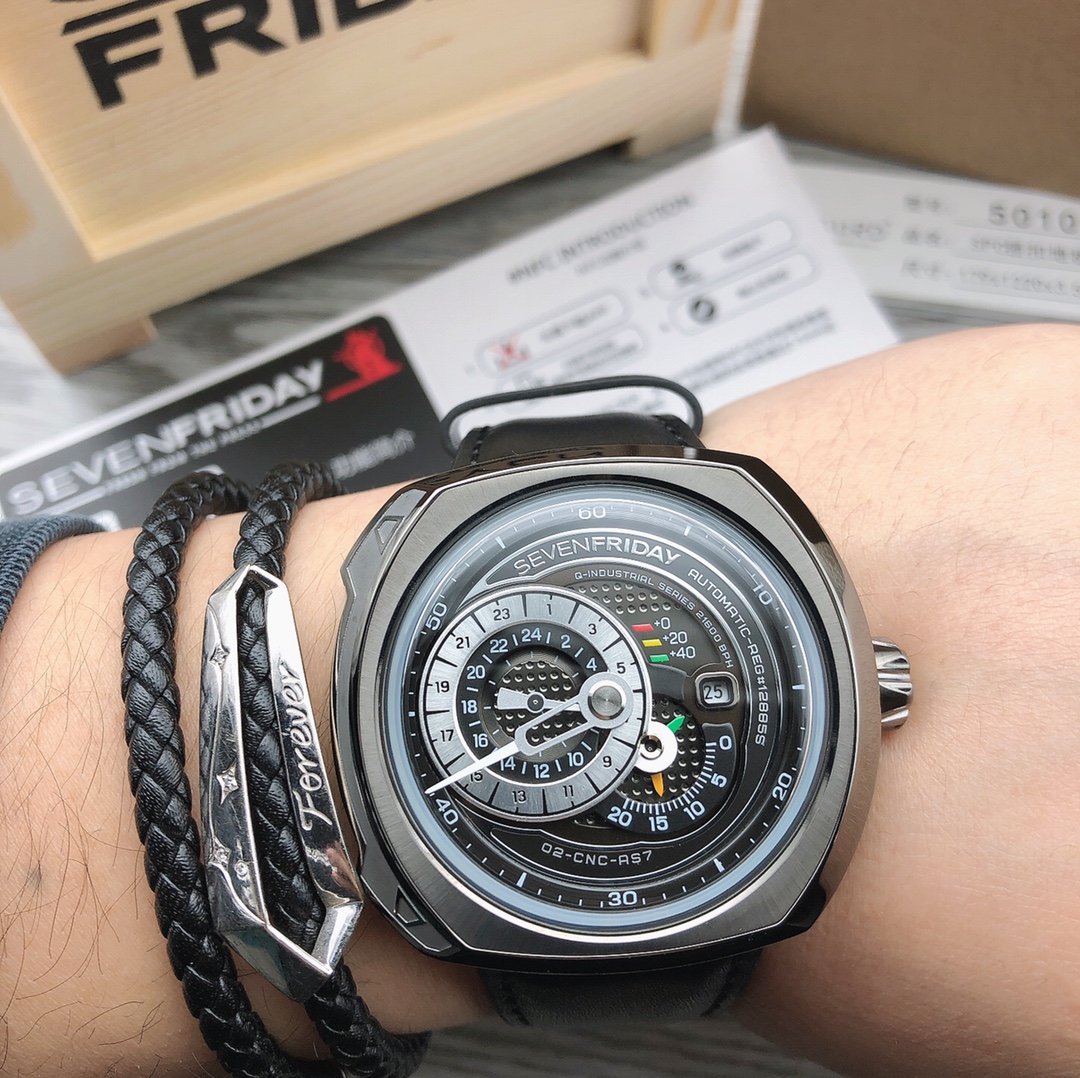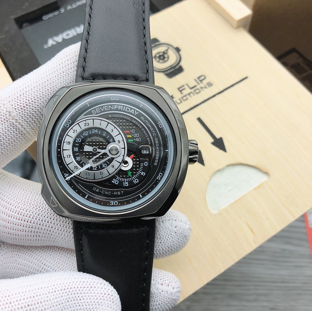 Seven Friday's first watch with a calendar function. Never worry about misreading the time again! The unique off-center 9-position subdial hand serves as the hour hand, displaying 24-hour AM/PM; the long hand indicates the minute.
