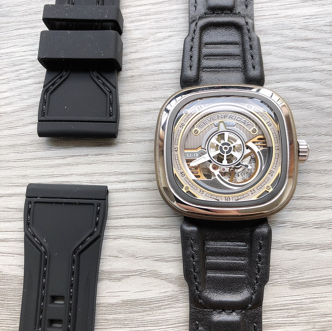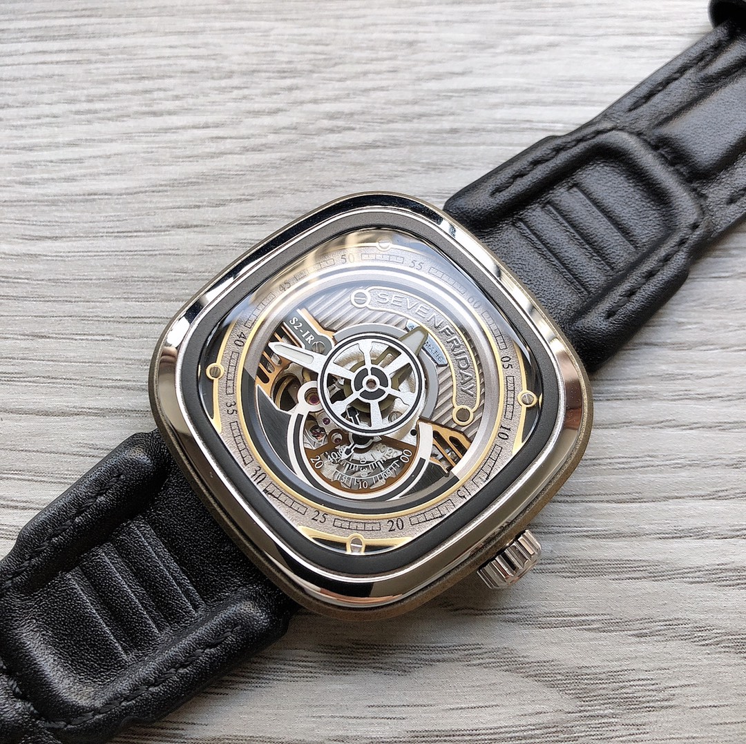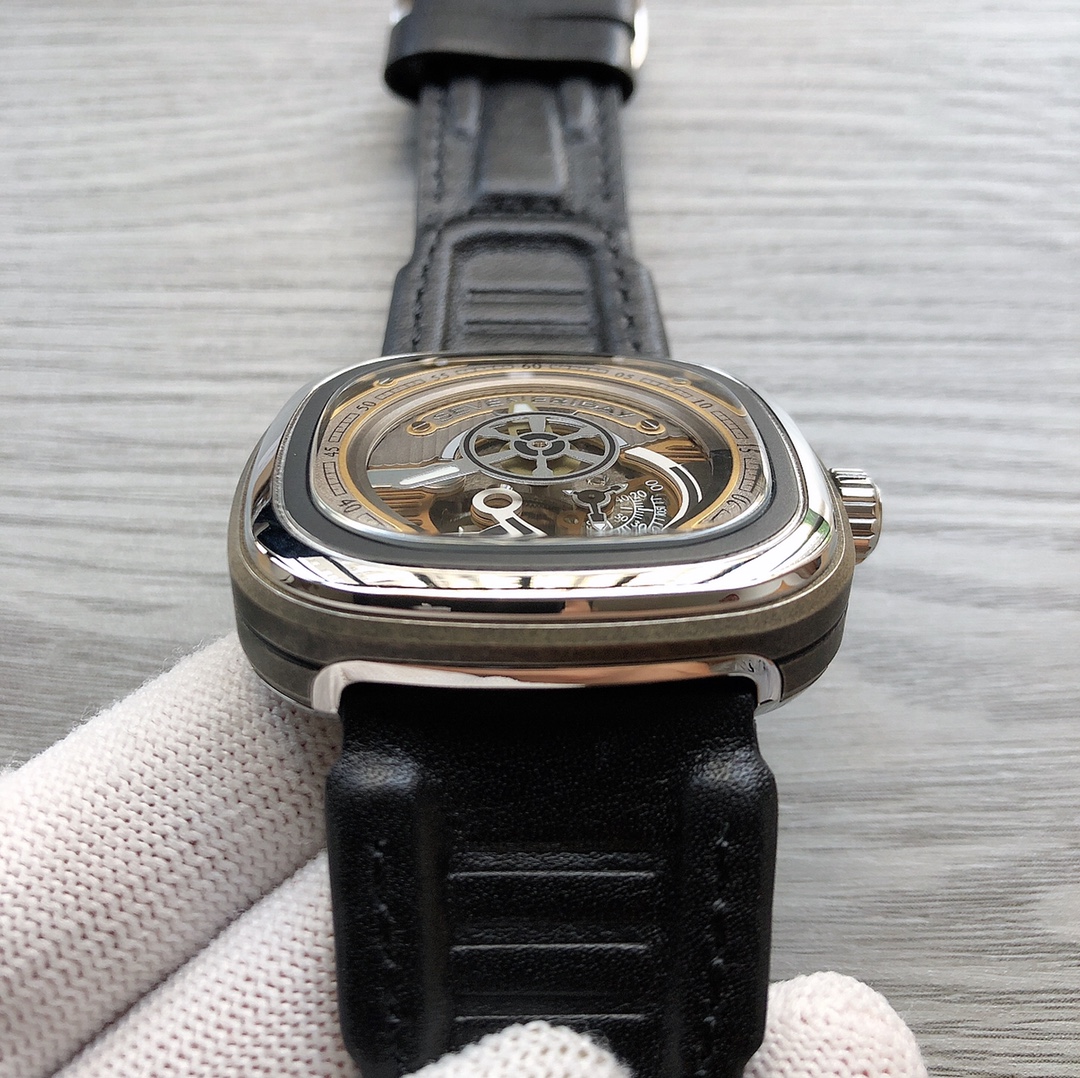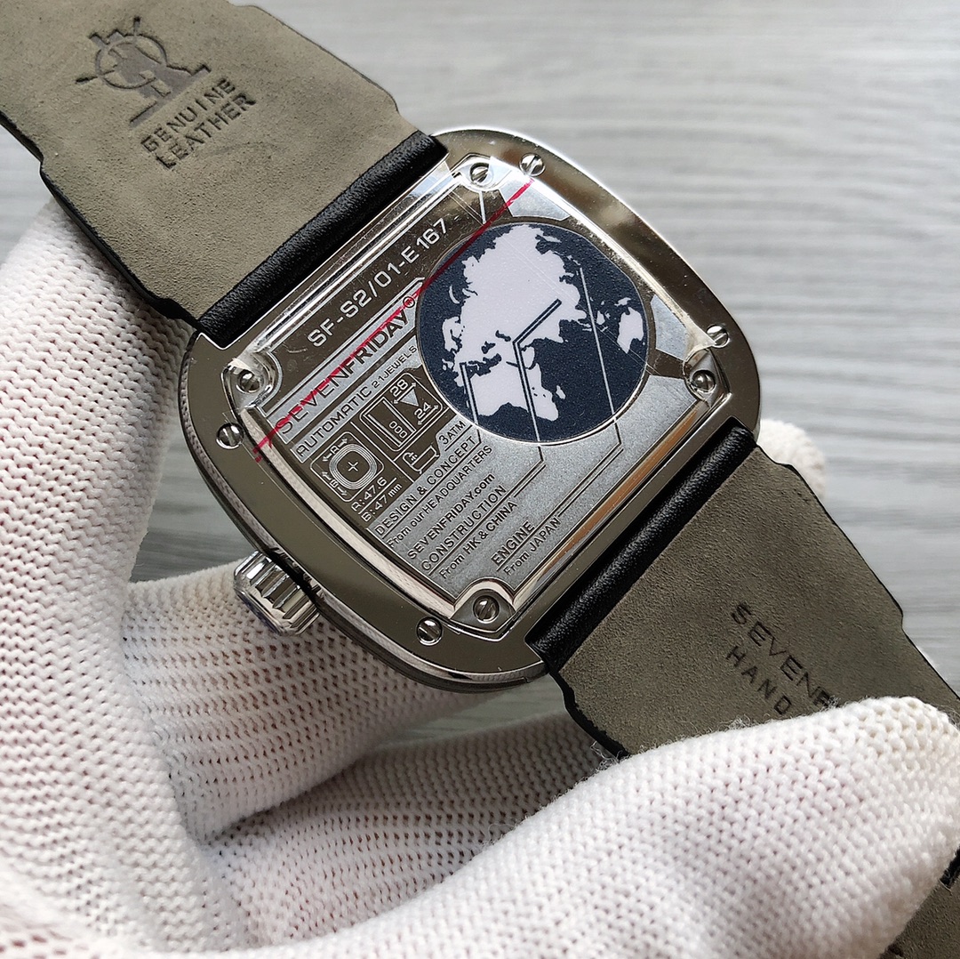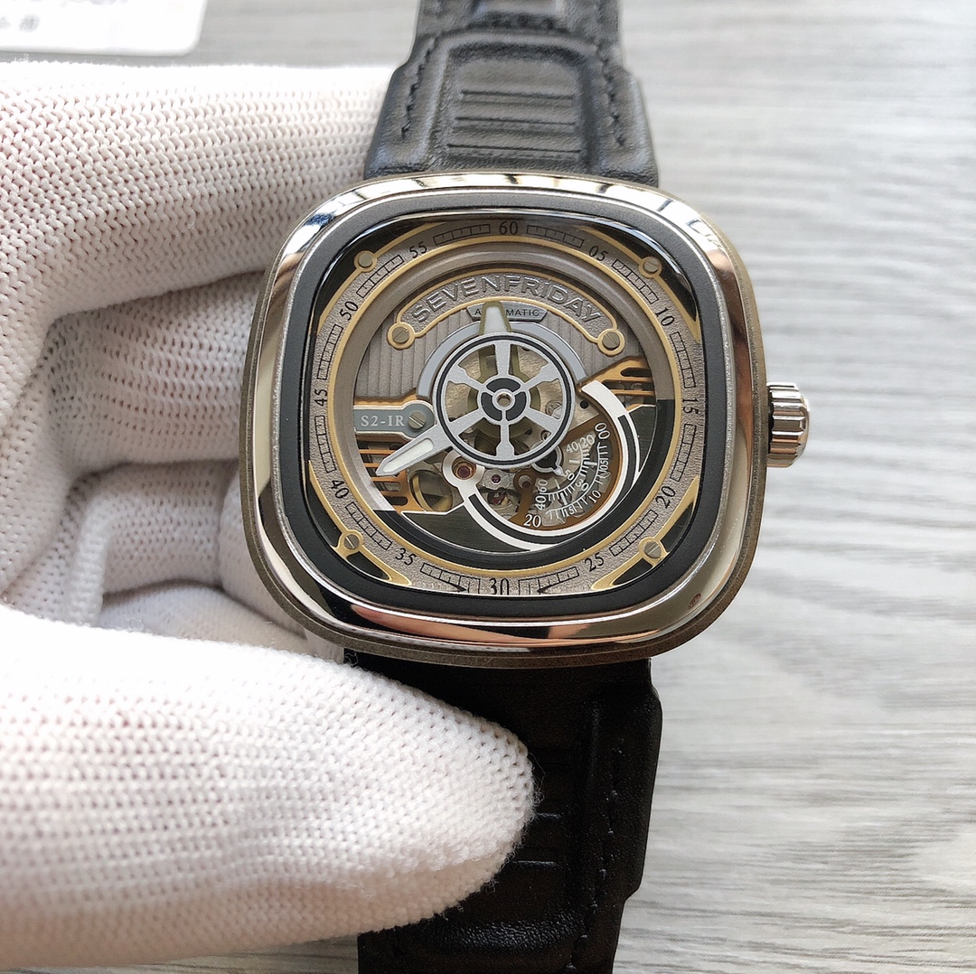 Original quality SevenFriday model S2/01 mechanical men's watch with polished rhodium "S" plate at 4 to 5 o'clock, transparent disc second hand, Miyota 82S5 open balance wheel, 40-hour power reserve, 47 x 47 mm case, 316L stainless steel, compatible with Apple and Android systems, and NFC. Sanjie recommends exquisite men's mechanical watches.