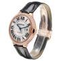 Replica Cartier Ballon Bleu 42 Rose Gold Diamond Mens Watch WE900851. Automatic self-winding movement. 18K rose gold round case 42.0 mm in diameter. Fluted crown set with the blue sapphire cabochon. 18K rose gold original Cartier factory diamond bezel. Scratch resistant sapphire crystal. Silver guilloche dial with black Roman numeral hour markers and blue sword-shaped hands. Date window at 3 o'clock. Secret Cartier signature at VII. Black leather strap with an 18k rose gold deployant clasp.