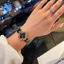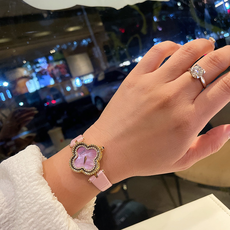 This watch, inspired by Van Cleef & Arpels' iconic motif, exudes timeless elegance. Its delicate diamond-set design, encircling the floral-shaped case, creates the illusion of being set within a mother-of-pearl dial. This watch pays homage to jewelry design.